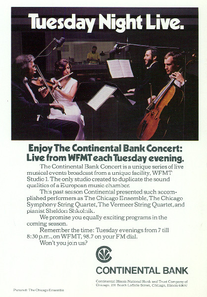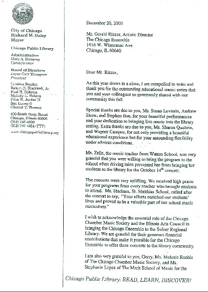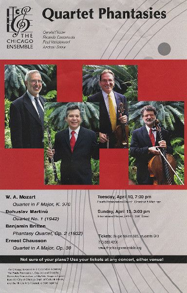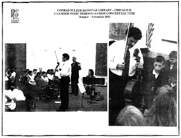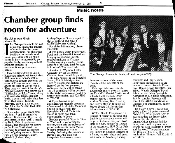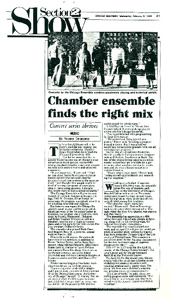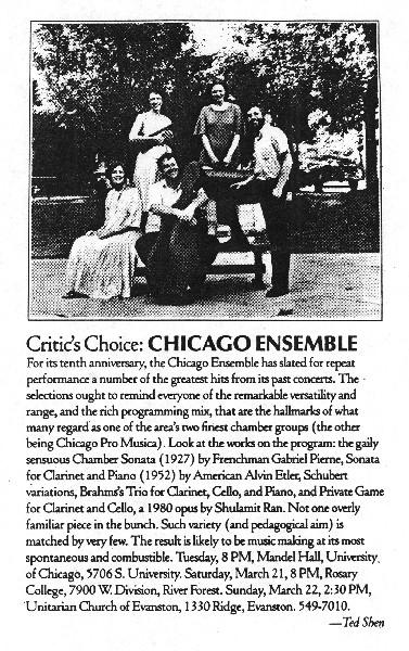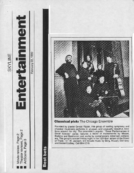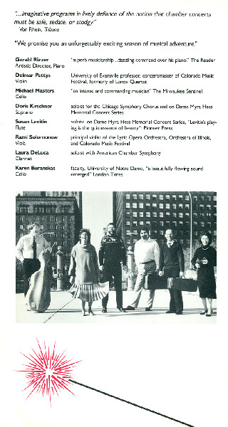 The Chicago Ensemble is in its 45th season of chamber music concerts, an extraordinary longevity for a Chicago chamber music group. Under the direction of its founder and artistic director, Gerald Rizzer, the Chicago Ensemble was one of the first ensembles in the country to present a chamber music concert series with varying combinations of instruments and voice. Acclaimed “virtuosos of variety” (John von Rhein, Chicago Tribune), the group presents masterpieces of the classical music repertoire, little-known works from the past, and new works selected through its “Discover America” competitions for new works. In addition to the subscription series, The Chicago Ensemble has presented children’s demonstration / performances in conjunction with Sulzer Regional Library; has toured regionally; offers workshops for adult amateur players; and has been a frequent guest on WFMT live broadcasts. Recently, in the fall of 2020, the Ensemble produced 3 video presentations focused on children. The Ensemble is proud to have served Chicago for so long while retaining its quality of music and unique style. The images below are a snapshot of the Chicago Ensemble’s varied history.